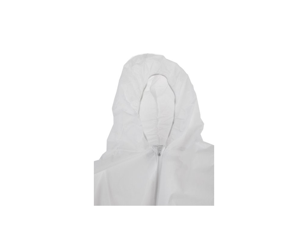 Kombinéza s elastickou kapucí, elastické manžety a pas, zapínání na zip, polypropylen 40 g/m, barva bílá, velikost XL.Doplňkové parametry