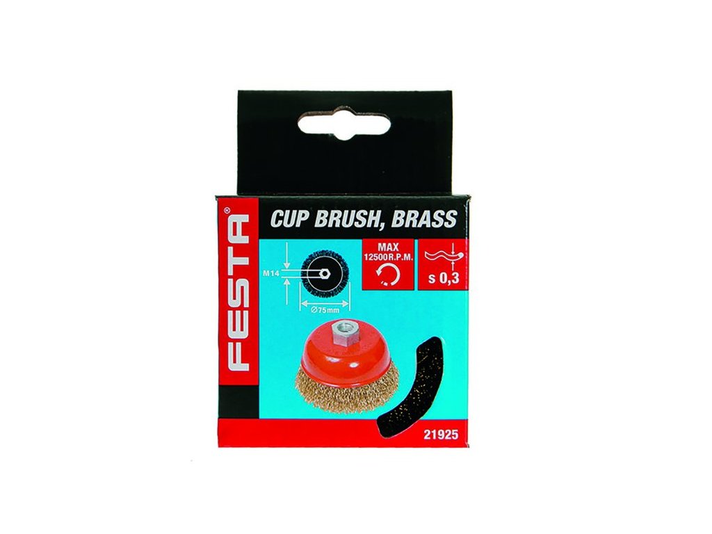 Kartáč miskový s mosaznými vlnitými drátky, uchycení M14, hrnkový, vhodné pro nerezové materiály. <ul style="color: red"> <li type="square"><a href="https://www.youtube.com/watch?v=Gu1sL6isc6E">Instruktážní video</a></li> </ul>Doplňkové parametry