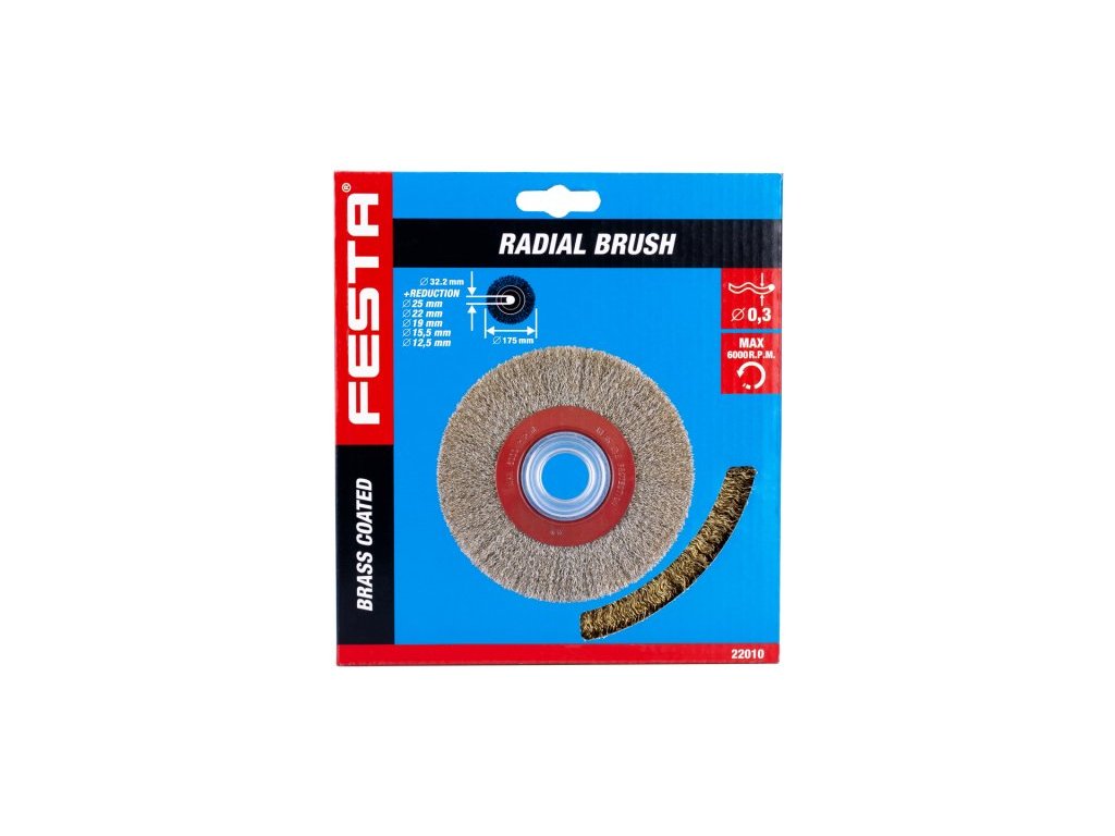 Rotační kartáč - okružní, provedení : vlnitý drát, kartáče FESTA zaručují kvalitní použité materiály i zpracování, drát 0,3 mm - pomosazený, průměr 175 mm, uchycení otvor 32mm (včetně redukčních kroužků 12,7mm - 1/2, 15,8 mm - 5/8, 19 mm - 3/4, 22,2 mm a 25,4 mm - 1), počet drátů 7200, délka drátů 41mm, maximální otáčky za min. 6000, vhodný pro zámečnické a kovoobráběcí práce, odstraňování rzi, barev, leštění.…, balení : papírový box.Doplňkové parametry