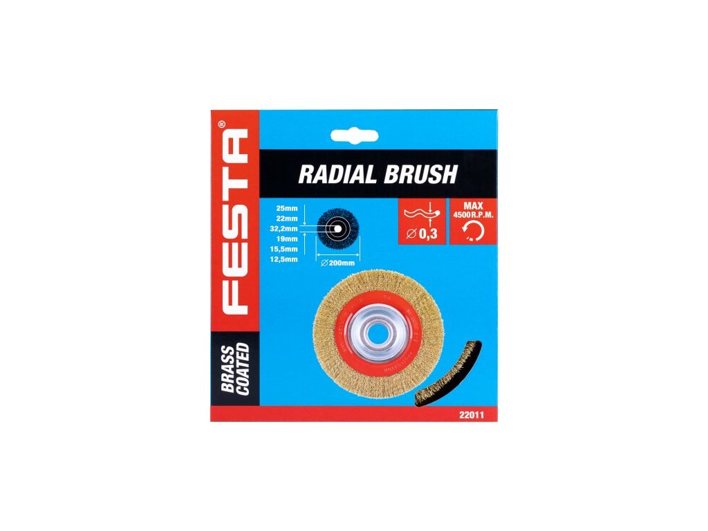 Rotační kartáč - okružní, provedení : vlnitý drát, kartáče FESTA zaručují kvalitní použité materiály i zpracování, drát 0,3mm - pomosazený, průměr 200mm, uchycení otvor 32mm (včetně redukčních kroužků 12,7 mm - 1/2, 15,8 mm - 5/8, 19 mm - 3/4, 22,2 mm a 25,4mm - 1), počet drátů 8000, délka drátů 34 mm, maximální otáčky za min. 4500, vhodný pro zámečnické a kovoobráběcí práce, odstraňování rzi, barev, leštění.… , balení : plastový box.Doplňkové parametry