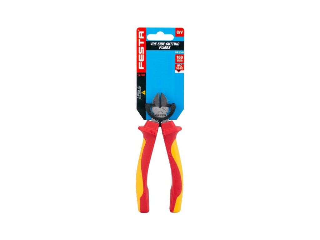 Kleště VDE boční štípací 160 mm FESTA mají certifikaci elektro VDE 1000 V, IEC/EN 60900-2004, kombinace polypropylenu a pryže na ergonomicky tvarovaných ručkách zaručuje výborné antiskluzové vlastnosti a dobrou odolnost vůči mazadlům a chemikáliím. Uchopovací čelisti obzvláště odolné proti opotřebení, chromvanadová vysoce výkonná ocel. Hmotnost 0,283 kg.Doplňkové parametry