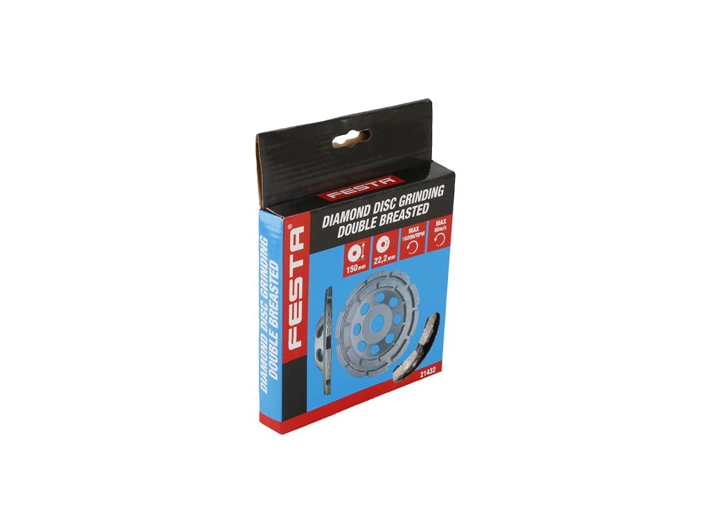 Brusný diamantový kotouč FESTA -dvouřadý, robustní nosný talíř je z pevné slitiny, speciální konstrukce uchycení diamantových segmentů k nosnému disku kotouče, vysoký obsah diamantového prachu v segmentech, použití : pro suché i mokré broušení mramoru, žuly, cihel, zdiva, přírodního i umělého kamene, obkladů, dlažeb, betonu..., tvar a provedení segmentů je vhodné pro hrubé a rchlé obrušování, rozměry : uvedeny v názvu výrobku, balení : papírový box s eurootvorem.Doplňkové parametry
