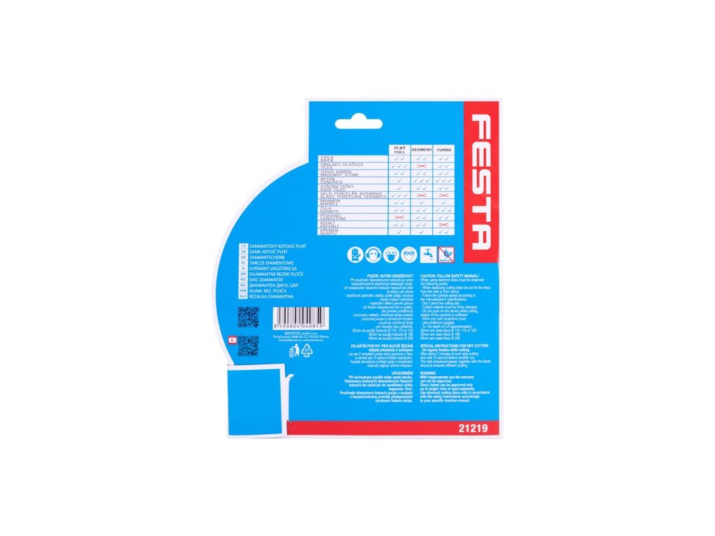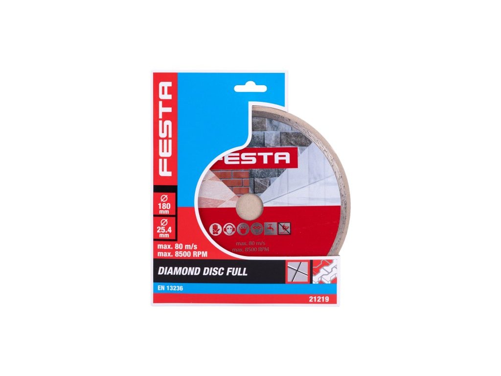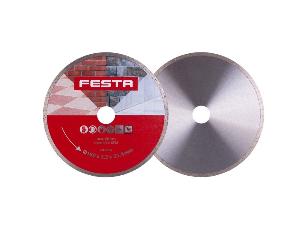 Profesionální diamantový kotouč FESTA, provedení : PLNÝ - celoobvodový, kvalitní diamantová vrstva s vysokým obsahem diamantového prachu, přesné zpracování - napojení na nosný disk kotouče odolávající vysokým teplotám, použití : určený pro mokré i suché řezání dlažby a obkladů, betonu, cihel, zdiva, žuly, mramoru, kamene, skla, keramiky, balení : blistr s eurootvorem, rozměry : uvedeny v názvu výrobku.Doplňkové parametry