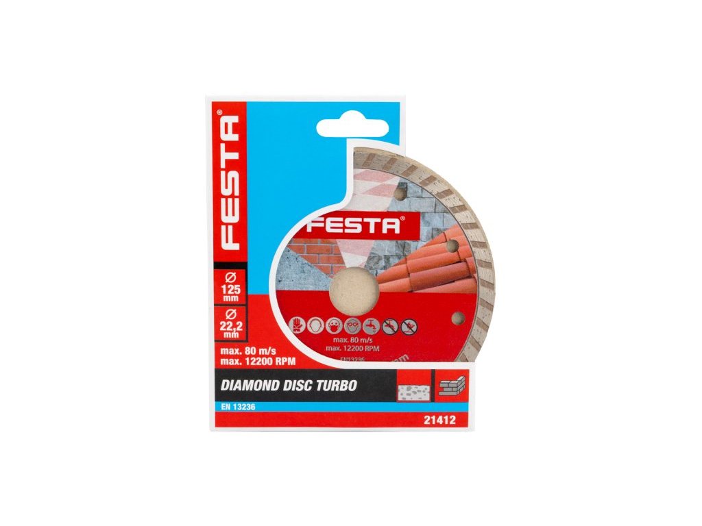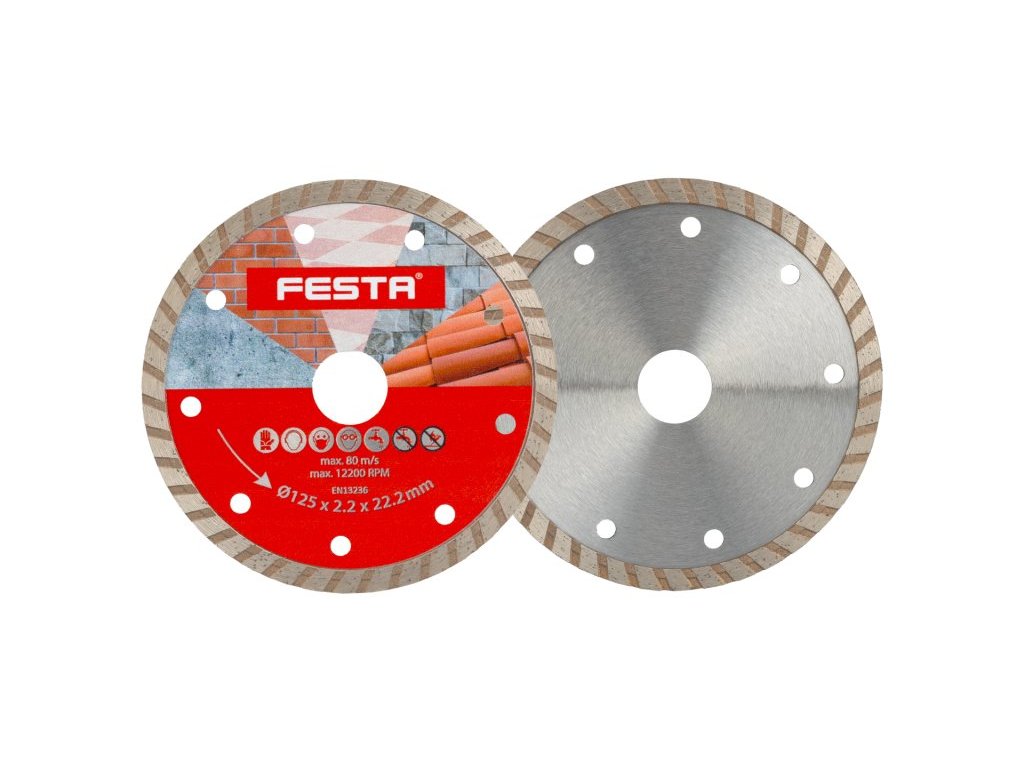Diamantový kotouč FESTA, provedení : TURBO, kvalitní materiály i zpracování, speciální tvar diamantových segmentů i konstrukce a pevné uchycení k nosnému disku kotouče, vysoký obsah diamantového prachu, použití : pro suché i mokré řezání betonu, železobetonu, cihel, zdiva, kamene, balení : blistr s eurootvorem, rozměry : uvedeny v názvu výrobku. <ul style="color: red"> <li type="square"><a href="https://www.youtube.com/watch?v=Gu1sL6isc6E">Instruktážní video</a></li> </ul>Doplňkové parametry