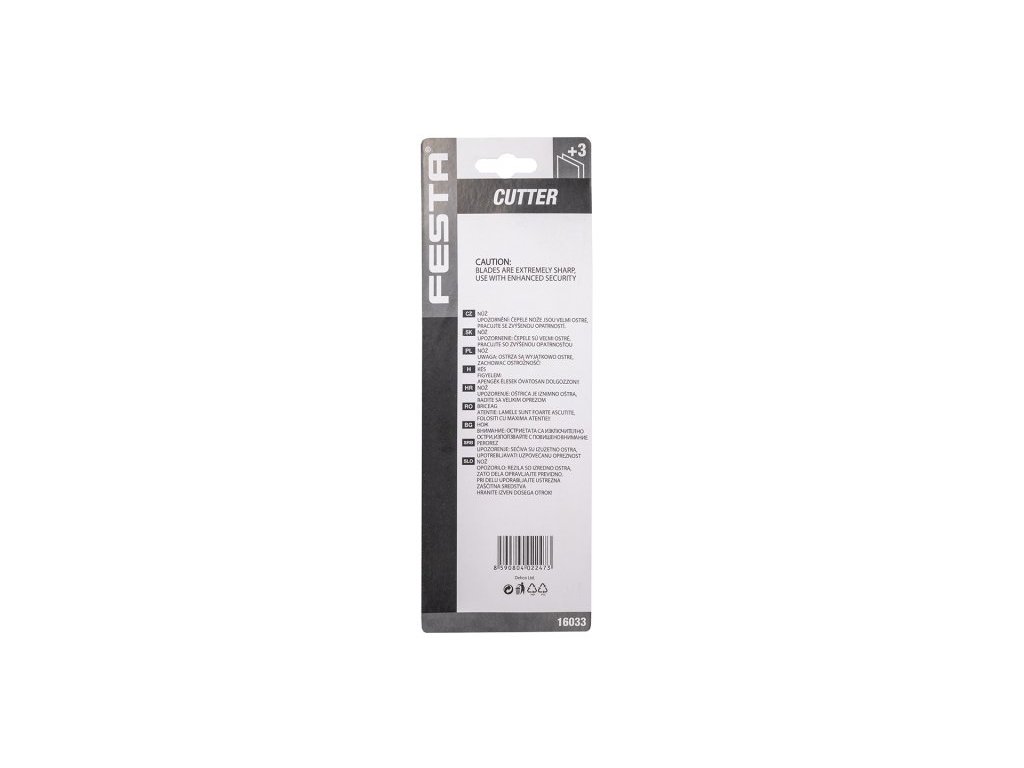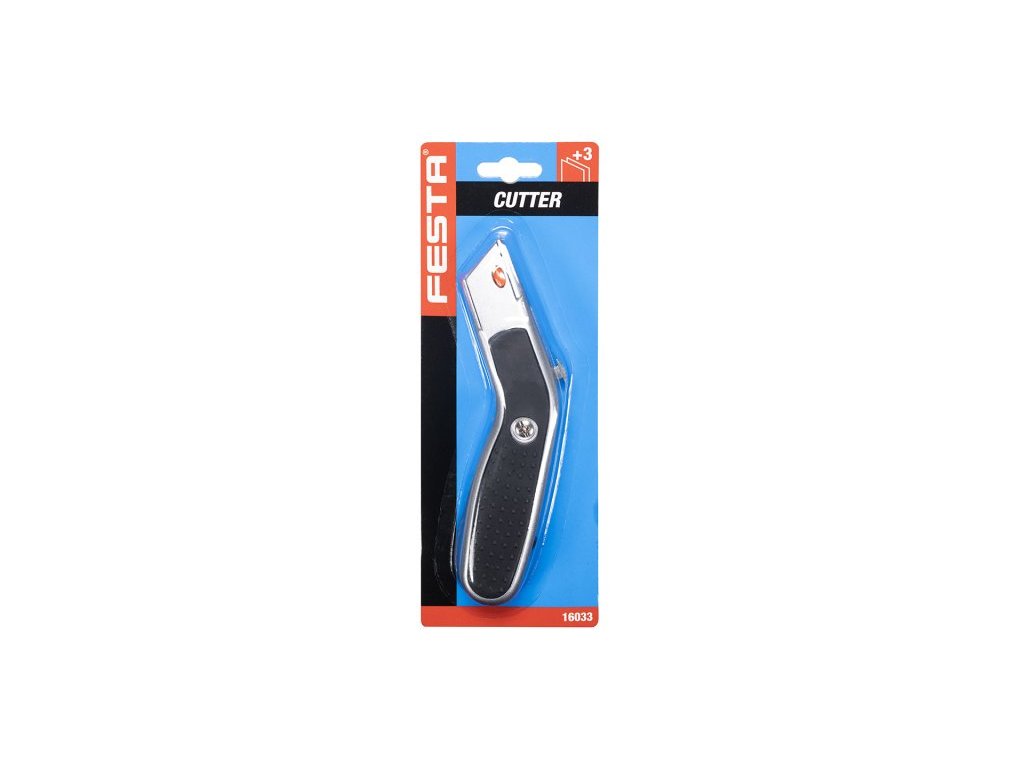 Kovový nůž s výsuvnou lichoběžníkovou čepelí, čepel uchycena uvnitř těla nože na posuvném jezdci, ergonomický tvar s pogumovanou rukojetí, výklopný zásovník na náhradní čepele.Doplňkové parametry