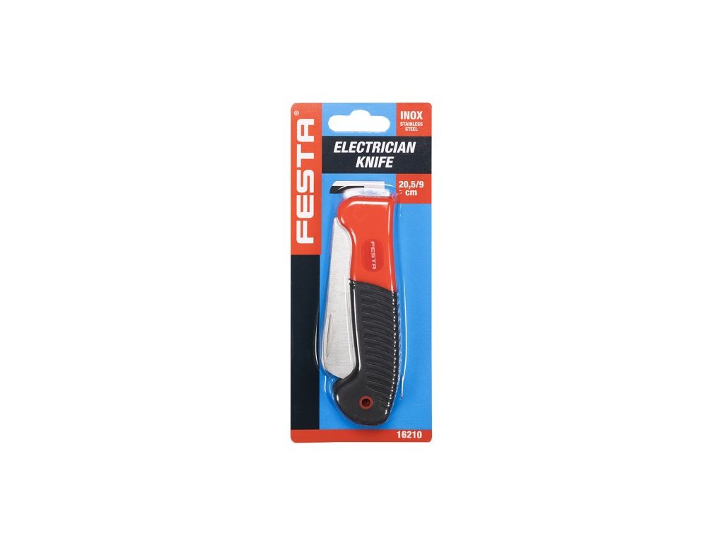 Zavírací elektrikářský nůž s rovnou čepelí, silná čepel se dvojím ostřím usnadňujícím odizolovávání vodičů, pogumovaná ergonomická rukojeť, blistr.Doplňkové parametry