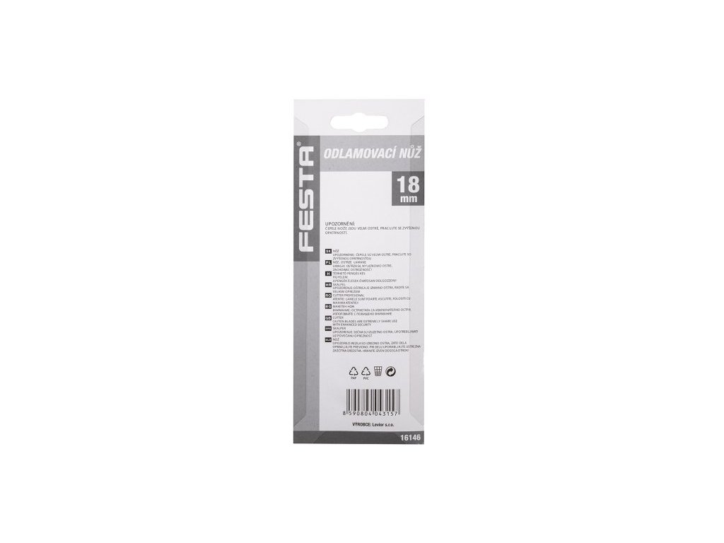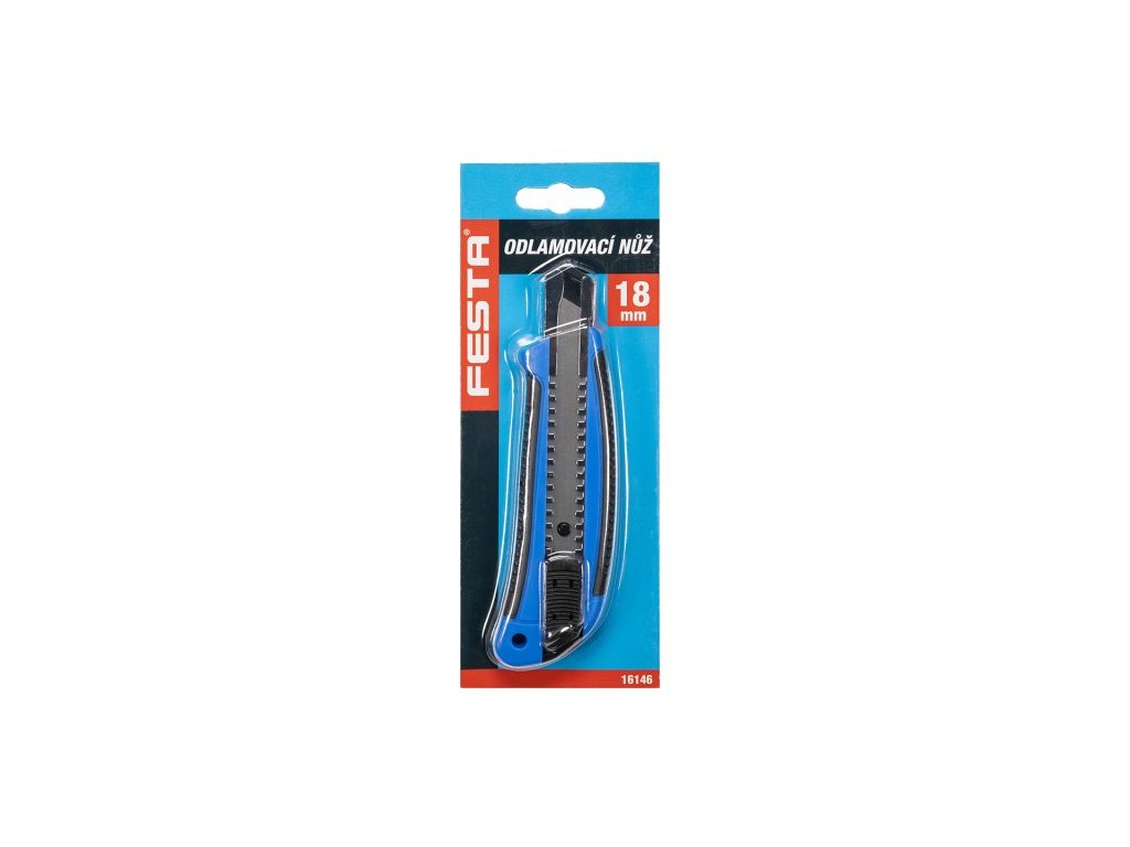 Odlamovací nůž FESTA 18mm, kvalitní materiály, ergonomický tvar s protiskluznou úpravou, kovová lišta, automatická posuvná aretace, do nože lze umístit až 2 náhradní břity, blistr.Doplňkové parametry