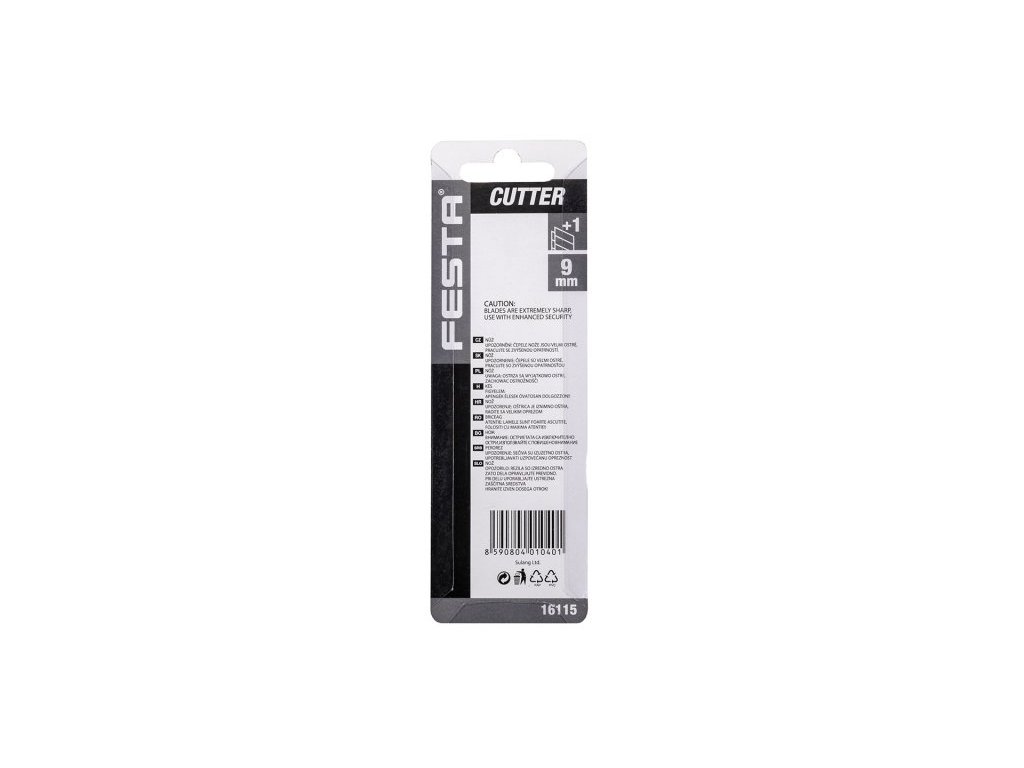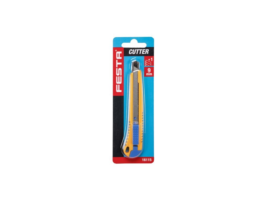 Odlamovací nůž FESTA 9mm, kvalitní materiály, kovová lišta, automatická aretace s pojistkou, 1 náhradní břity, blistr.Doplňkové parametry