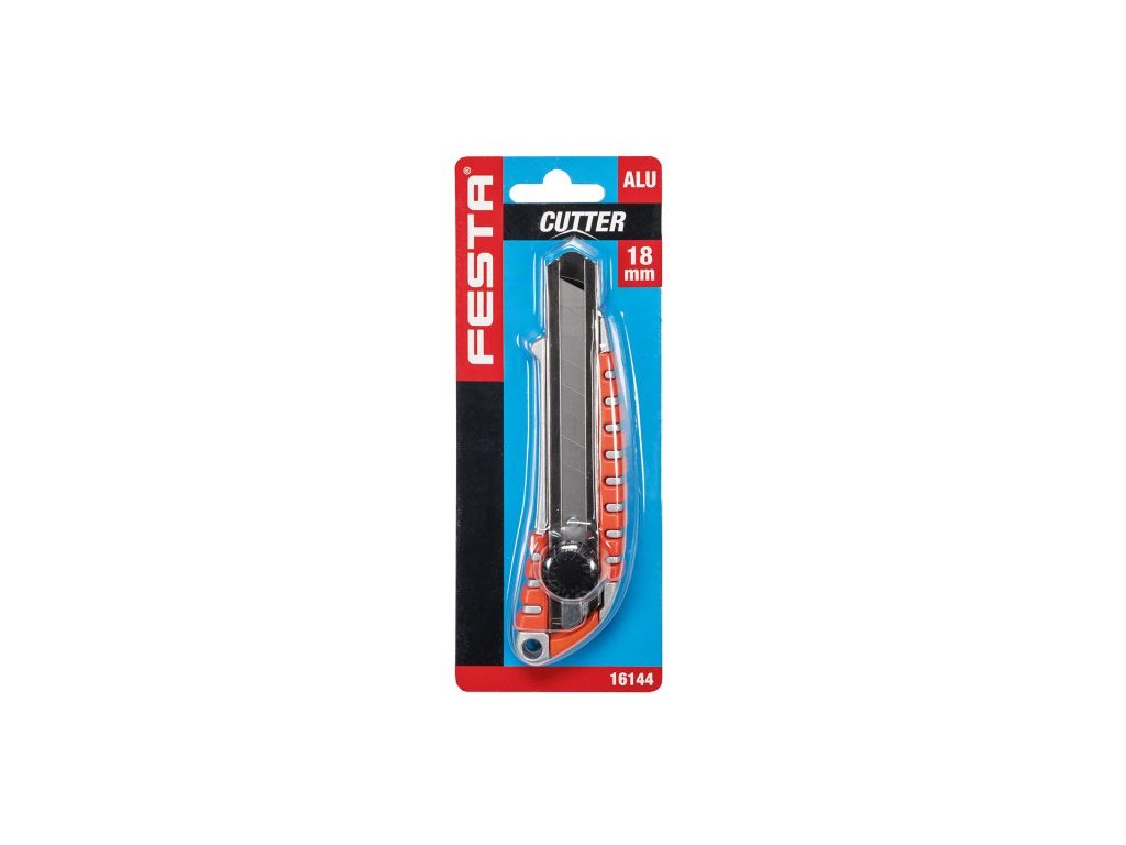 Odlamovací nůž FESTA 18mm, kvalitní materiály, celokovové tělo nože, protiskluzné plastové výstupky, kovová lišta, odolná šroubková aretace, do nože lze umístit až 2 náhradní břity, blistr.Doplňkové parametry