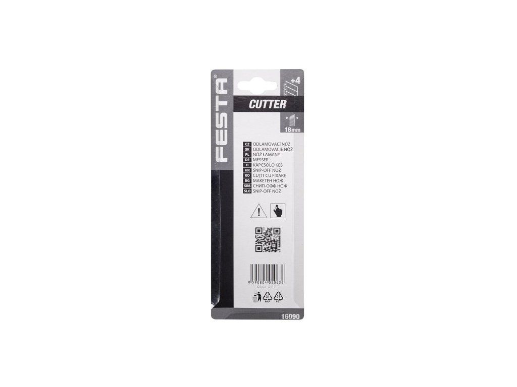Profesionální odlamovací nůž FESTA 18mm, moderní a funkční design, bezpečnost a ergonimie, celokovové tělo s pogumovanou úchopovou částí, zásobník náhradních břitů, automatická výměna břitu (při naplněném zásobníku), automatická aretace s přítlačnou pojistkou břitu, baleno na blistru.Doplňkové parametry