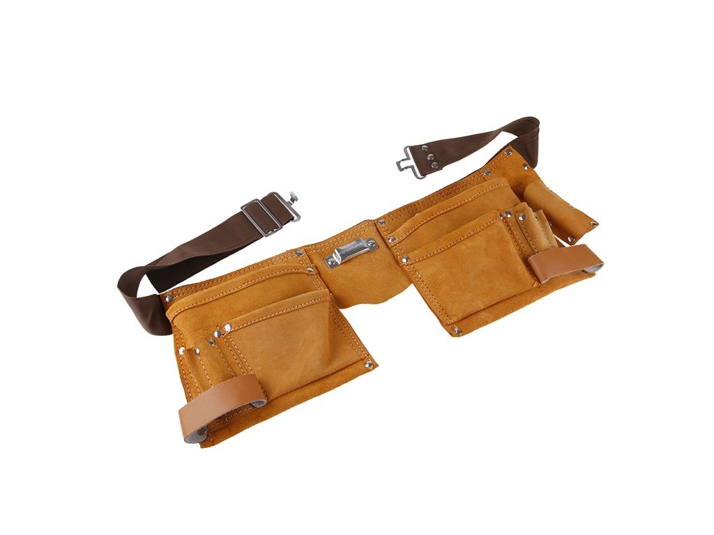 Nářaďový pás, 11 kapes, kůže / nylon, použití : k uložení nářadí a pomůcek, usnadňuje manipulaci a práci - snadné odkladání nářadí i opětovné uchopení, uložení materiálu - hřebíků, šroubů…, komfortní široký nastavitelný pás.Doplňkové parametry