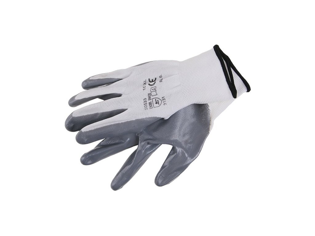 Bílý úplet z jemného nylonu, dlaň máčená v kvalitním černém nitrilu, CE EN 388, velikost 10.Doplňkové parametry
