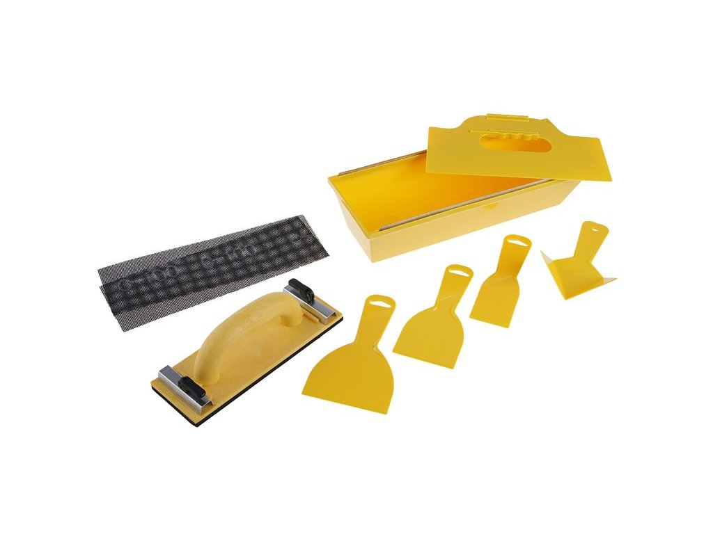 Sada pro sádrokartonáře 9 -dílná, složení : vanička, čtyři druhy špachtlí, 1 rohová, držák na brusnou mřížku, 2ks brusné mřížky zrnitost 100. Sada je určena na tmelení a broušení sádrokartonu.Doplňkové parametry