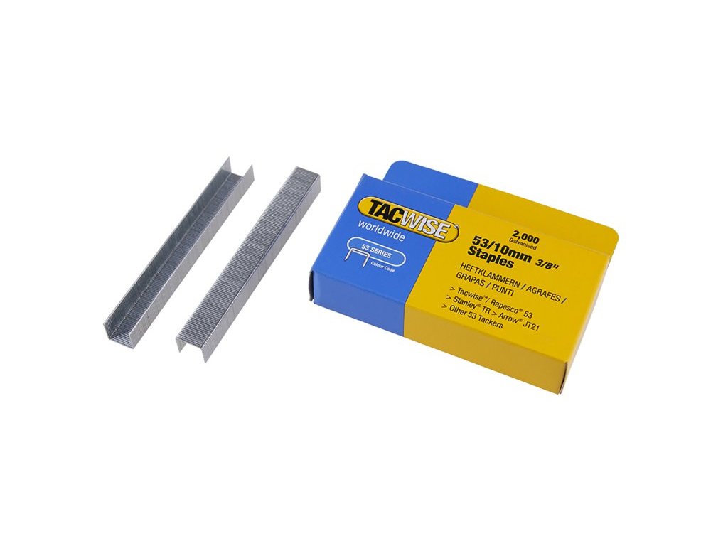 Kvalitní spony typ 53, šíře 11,3 mm, tl.0,7 mm a délka 10 mm. Vhodné pro sponkovačky Tacwise, Rapesco 53, Stanley TR, Arrow JT21 a jiné sponkovačky na spony typu 53.Doplňkové parametry