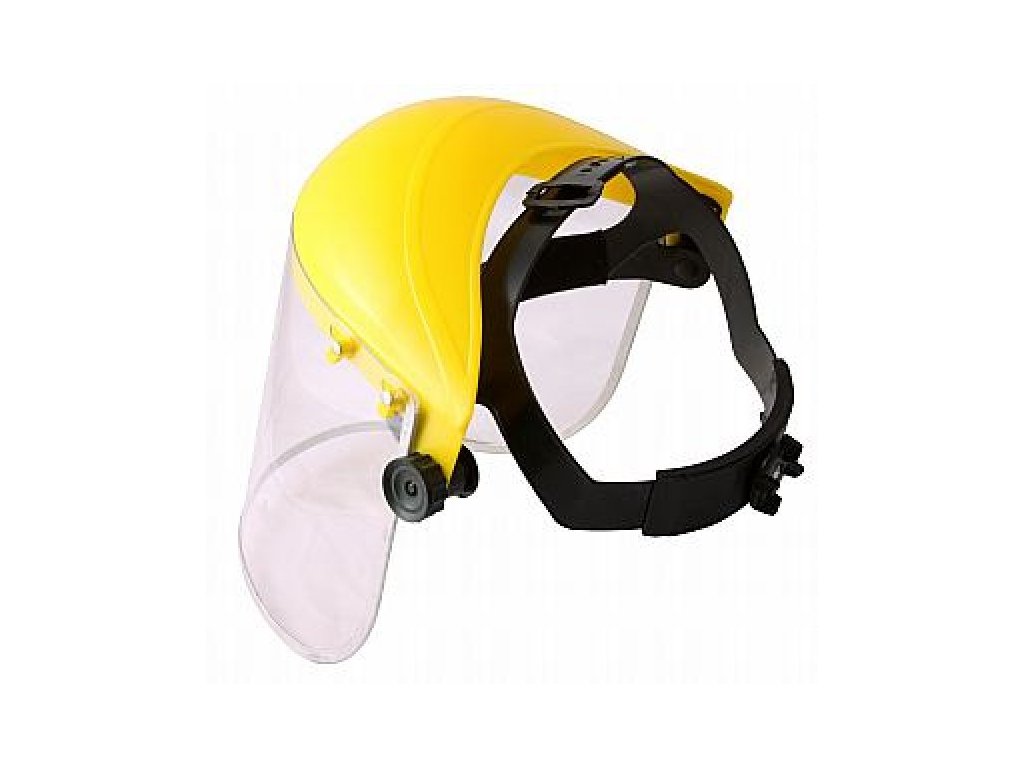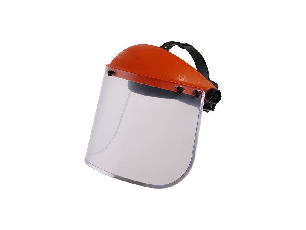 Čirý ochranný štít z polykarbonátovým zorníkem, jednoduše nastavitelná velikost díky otočnému kolečku, potítko vpředu, CE EN 166.Doplňkové parametry