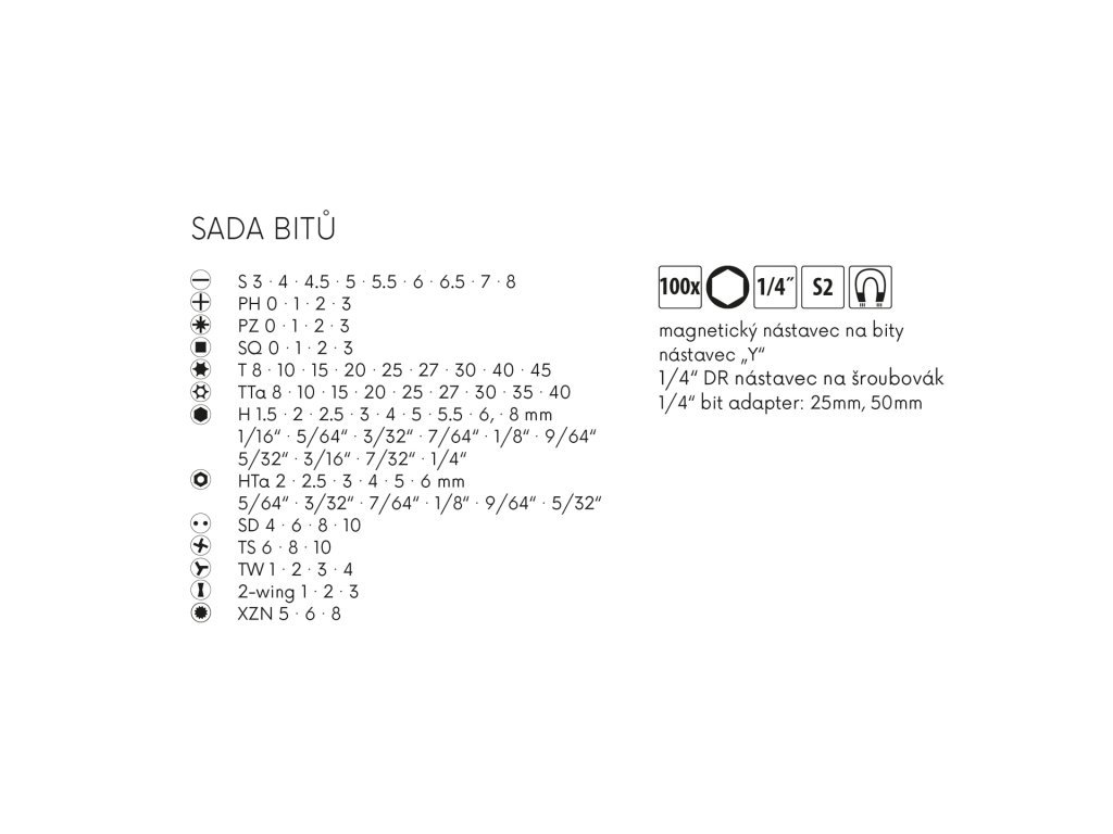 <!DOCTYPE HTML PUBLIC "-//W3C//DTD HTML 4.0 Transitional//EN"> <HTML><HEAD> <META content="text/html; charset=UTF-8" http-equiv=Content-Type> <STYLE type=text/css>body, p { font-family: Tahoma, sans-serif;font-size: 10pt; }pre { font-family: monospace; font-size: 9pt; }h1, h2, h3 { font-family: serif; }</STYLE> <META name=GENERATOR content="MSHTML 11.00.10570.1001"></HEAD> <BODY>Sada bitů 100ks, CrV ocel. Sada obsahuje: SQ, PH, PZ, S, T, Tta, H, Hta, SD, TS, TW, 5/32, 3/16, XZN. Magnetický nástavec na bity. Nástavec Y. 1/4 DR nástavec na šroubovák. 1/4 bit adapter: 25mm, 50mm.</BODY></HTML>Doplňkové parametry
