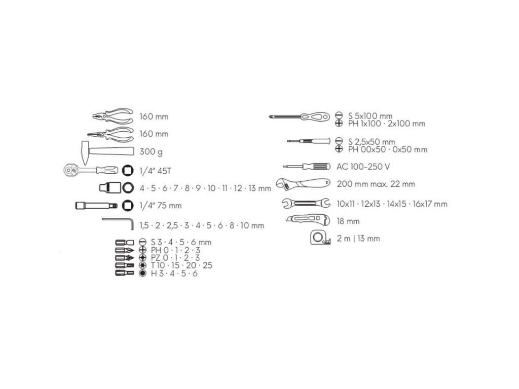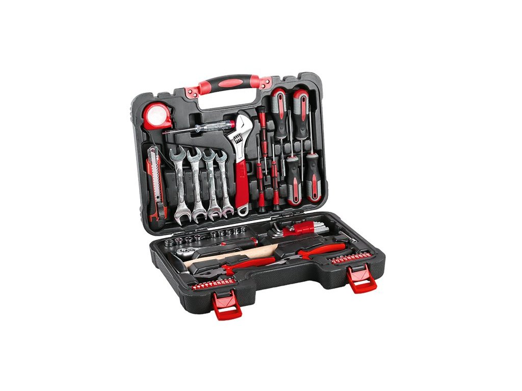 <ul style="color: red"> <li type="square"><span style="color: black"> univerzální sada nářadí osazená nejčastěji používaným nářadím, které by nemělo chybět v žádné domácnosti</li> <li type="square"><span style="color: black"> přehledná organizace, snadná manipulace a prostorově nenáročné uložení v plastovém kufru</li> </ul>Doplňkové parametry