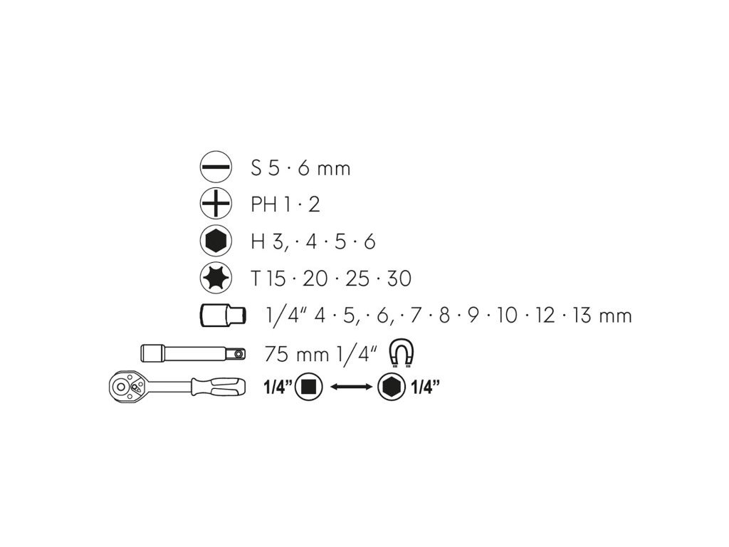 <ul style="color: red"> <li type="square"><span style="color: black"> sada adapterů a bitů s oboustrannou ráčnou <b>na bit 1/4", nebo adapter 1/4"</b></li> <li type="square"><span style="color: black"> chromvanadiová ocel, plastový přehledný box</li> <li type="square"><span style="color: black"> osazení sady - viz obrázek</li> </ul>Doplňkové parametry