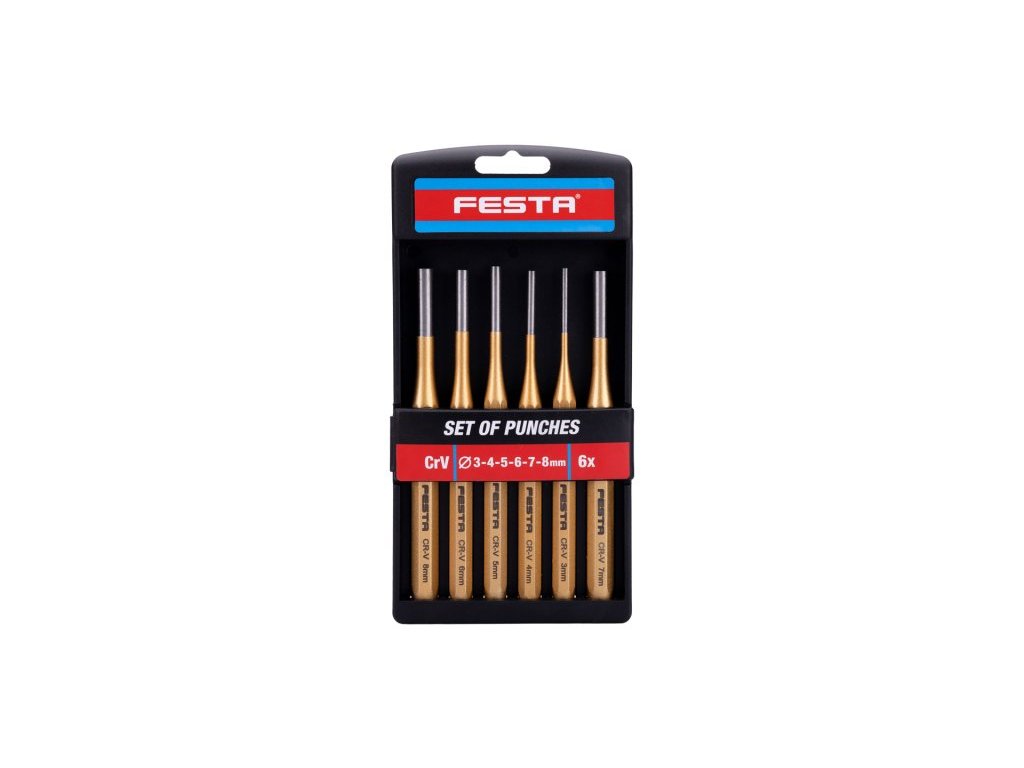 Sada průbojníků TiN FESTA vyrobena z chrom vanadové oceli. Sada obsahuje 6 ks : 3, 4, 5, 6, 7, 8 mm.Doplňkové parametry