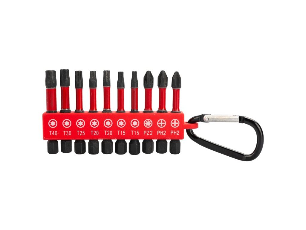 <ul style="color: red"> <li type="square"><span style="color: black"> sada torzních bitů v plastovém držáku s karabinou</li> <li type="square"><span style="color: black"> obsah sady <b>2x PH2, PZ2, T 15-20-25-30-40</b></li> <li type="square"><span style="color: black"> torzní bity z oceli S2, určený zejména pro rázové utahováky s velkým kroutícím momentem</li> <li type="square"><span style="color: black"> speciální tepelné zpracování a geometrie bitu snižují pnutí v bitu - bit má větší pružnost v krutu a tím nedochází, při rázech utahováku, k praskání</li> <li type="square"><span style="color: black"> precizní opracování hrotu bitu zajišťuje jeho přesné zapadnutí a držení ve spojovacím materiálu</li> <li type="square"><span style="color: black"> bity vhodné pro konstrukční vruty při práci s rázovými utahováky</li> </ul>Doplňkové parametry
