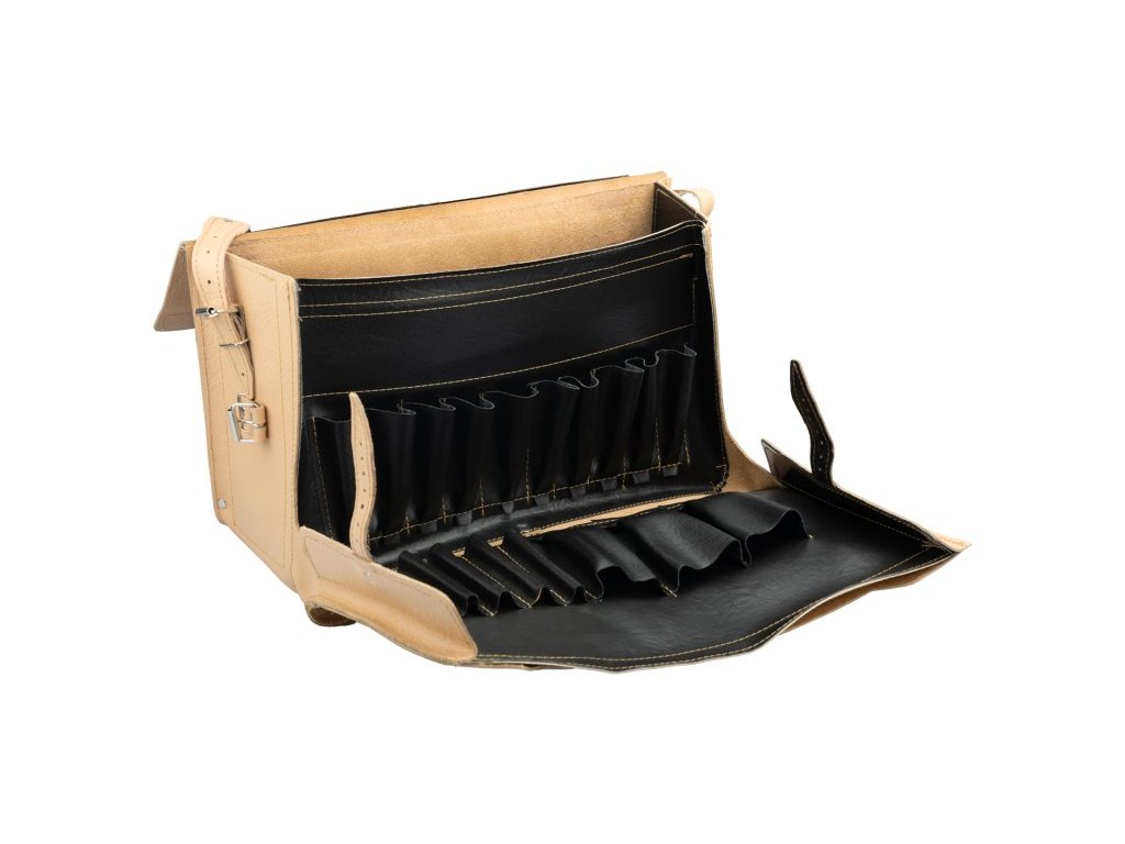 Elektrikářská brašna rozkládací z přírodní usně. Otevírací čelní strana s kapsičkami pro přehledné uložení nářadí a velkou kapsou na výkresy. Výztuha dna, boků a zadní kapsy pro další nářadí. Ideální pro zámečníky, seřizovače atd. Brašna je ušita speciální PES nití Amann, nosnost nitě je 12 kilo, švy jsou v exponovaných místech ještě nýtovány. Prvky: výklopná přední strana brašny, držadlo, popruh přes rameno, ocelová výztuha hřbetu. Vnitřní konstrukce: 1 plochá kapsa na dokumenty, příčka v hlavním úložném prostoru, přihrádky na šroubováky a drobné nářadí ve dvou řadách. Výztuhy: dno, hřbet, boky brašny, vnitřní kapsa. Hlavní materiál: přírodní hovězinová useň.Doplňkové parametry