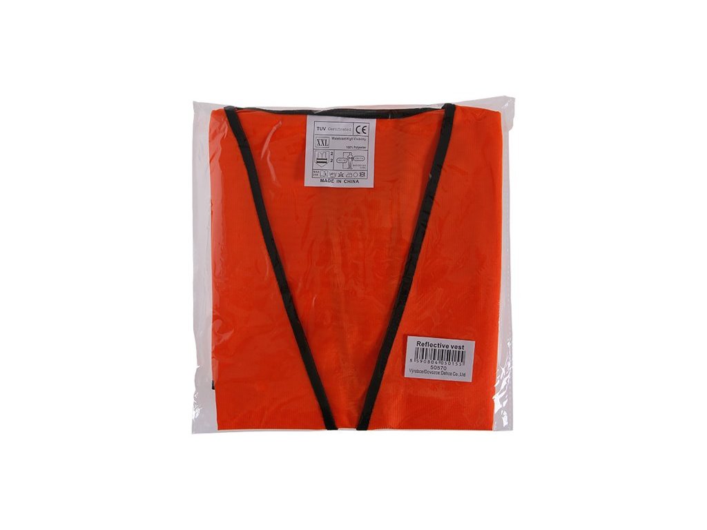 Oranžová polyesterová výstažná vesta, 2 horizontální reflexní pruhy, zapínání na suchý zip, velikost UNI , CE EN 471.Doplňkové parametry