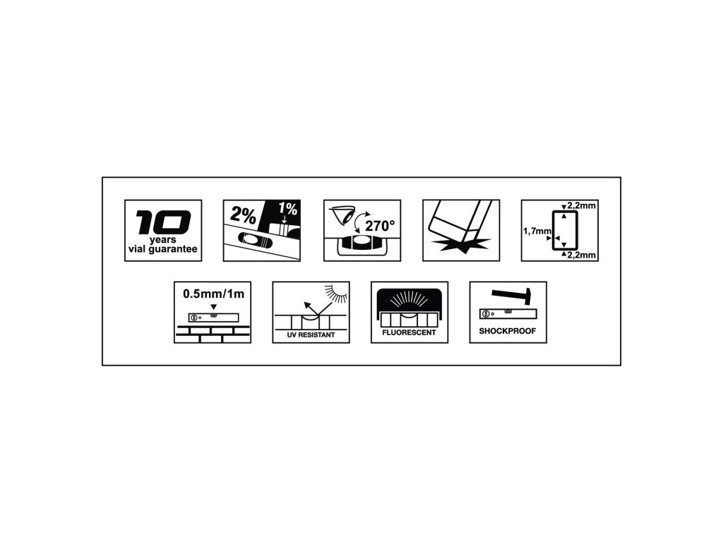 <ul style="color: red"> <li type="square"><span style="color: black"> profesionální vodováha <b>přesnost 0,5 mm / m - každý kus elektronicky testován</b></li> <li type="square"><span style="color: black"> hliníkový profilovaný a vyztužený profil <b>síla stěny 2,2 mm</b></li> <li type="square"><span style="color: black"> 3 libely z akrylového skla <b>nárazuvzdorné</b> -<ul style="color: red"> <li type="disc"><span style="color: black"> <b>1 horizontální válcová* se sklonovými ryskami 1 a 2%</b> <i><b>(+válcový tvar libely, oproti kvádrové, zajišťuje skvělou viditelnost ze všech úhlů pohledu</b></i></li> <li type="disc"><span style="color: black"> vertikální</li> <li type="disc"><span style="color: black"> 45°</ul> <li type="square"><span style="color: black"> <b>UV stabilní a fluorescenční kapalina v libelách pro lepší viditelnost</b></li> <li type="square"><span style="color: black"> pogumované <b>nárazuvzdorné koncovky</b> pro větší odolnost při případných pádech</li> <li type="square"><span style="color: black"> <b>záruka na libely 10 let</b></li> </ul> <ul style="color: red"> <li type="square"><a href="https://www.youtube.com/watch?v=C5q3i-BQ4o8">Instruktážní video</a></li> </ul>Doplňkové parametry