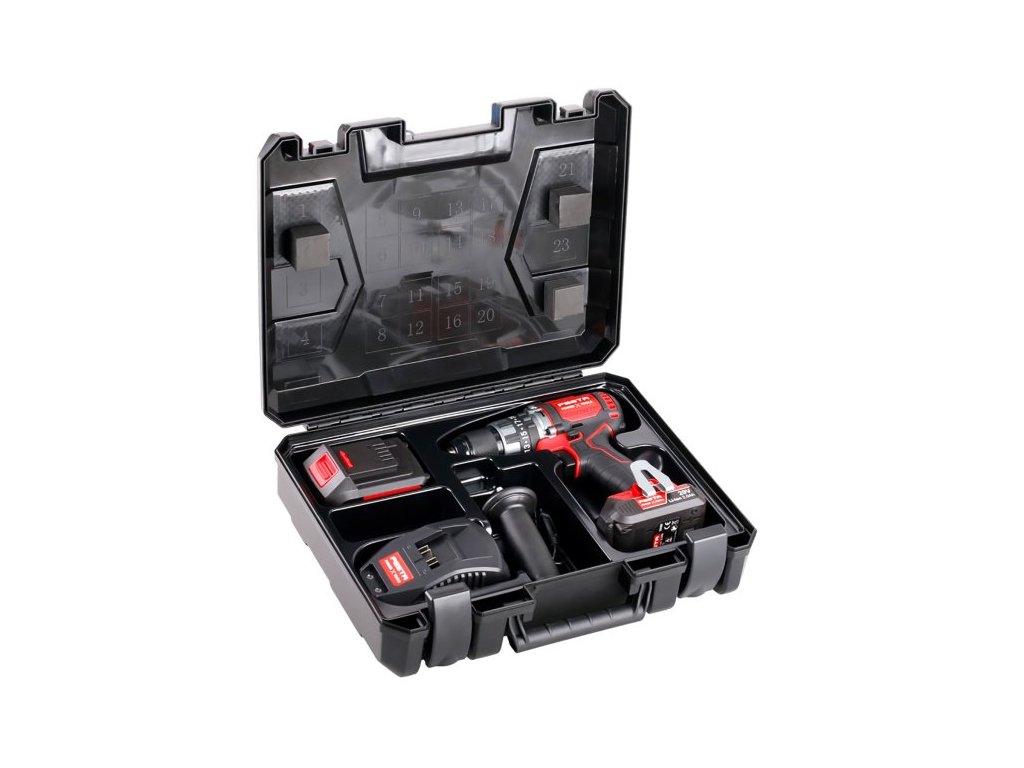 <ul style="color: red"> <li type="square"><span style="color: black"> vrtací AKU šroubovák s příklepem <b>BRUSH<span style="color: red">LESS</b><span style="color: black"> - bezkartáčový (bezuhlíkový) motor s velkým výkonem <b>80 Nm</b></li> <li type="square"><span style="color: black"> nový moderní typ motoru <b>BRUSH<span style="color: red">LESS</b><span style="color: black"> je <b>výkonnější, má menší nároky na spotřebu energie a delší životnost</b></li> <li type="square"><span style="color: black"> lehký, výkonný a použitelný do většiny materiálů - <b>kovy, dřevo, plasty a díky příklepu také do zdících materiálů</b></li> <li type="square"><span style="color: black"> <b>celokovová převodovka</b> dává možnost plně využít maximální výkon a zajišťuje plynulý chod AKU vrtačky</li> <li type="square"><span style="color: black"> otáčky <b>0 - 550 / 0 - 2000 min -1</b>, sklíčidlo <b>2 - 13 mm</b>, hmotnost bez baterie <b>1.4 kg</b></li> <li type="square"><span style="color: black"> plynulé nastavení volby druhu použití otočným prstencem - vrtání s příklepem * vrtání * šroubování s volbou utahovacího momentu v rozsahu 20ti stupňů</li> <li type="square"><span style="color: black"> pohodlná pogumovaná ergonomická rukojeť, umístění ovládacích prvků uzpůsobené pro pravou i levou ruku</li> <li type="square"><span style="color: black"> <span style="color: red"><b>FESTA</b> <span style="color: black"> <b>SHARE<span style="color: red"> 20 V</b><span style="color: black"> - AKU vrtačka je součástí skupiny výrobků s možností využívat <b>Li-ion</b> batarie Li-ion 2.0 Ah a 4.0 Ah ve všech strojích takto označených</li> <li type="square"><span style="color: black"> <b>Li-ion</b> technologie použitá v bateriích FESTA Power x tools nabízí možnost dobíjet baterie kdykoliv - bez snižování jejich kapacity, u <b>Li-ion</b> baterií také dochází k jen <b>velmi pomalému samovybíjení</b></li> <li type="square"><span style="color: black"> pro běžnou práci je baterie s kapacitou 2.0 Ah (28080) dostačující - nabíjecí čas 40 min., pro práci s předpokladem větší zátěže - vrtání s příklepem apod. doporučujeme použít baterii s kapacitou 4.0 Ah (28081) - nabíjecí čas 90 min</li> <li type="square"><span style="color: black"> v praktickém setu v kufru je kromě AKU vrtačky také - <b>baterie 4.0 Ah, baterie 2.0 Ah, rychlonabíječka 2.4 A, přídavná rukojeť</b></li> </ul> <ul style="color: red"> <li type="square"><a href="https://www.youtube.com/watch?v=j5rCsaZsjLA&t=77s">Instruktážní video</a></li> </ul>Doplňkové parametry