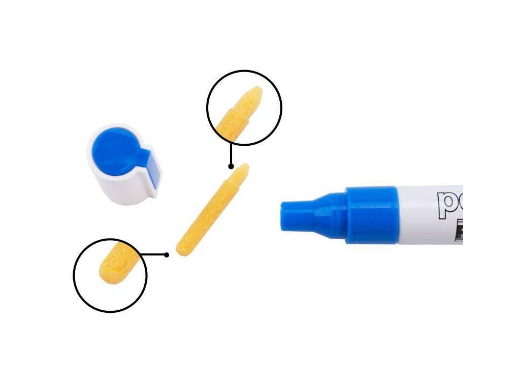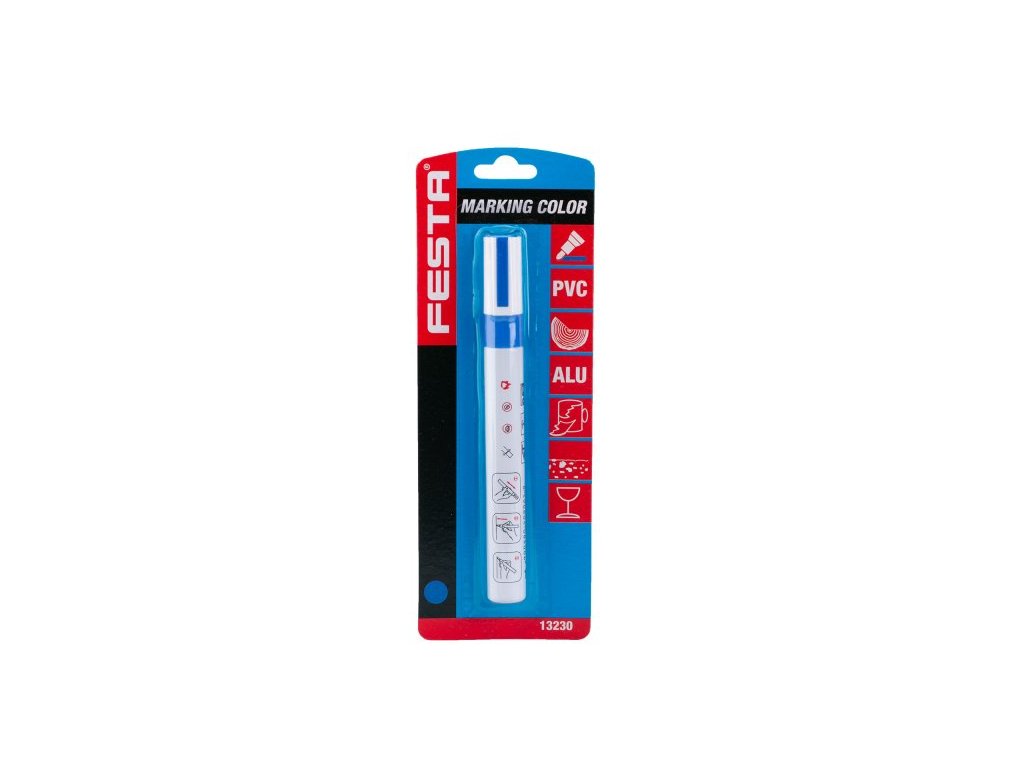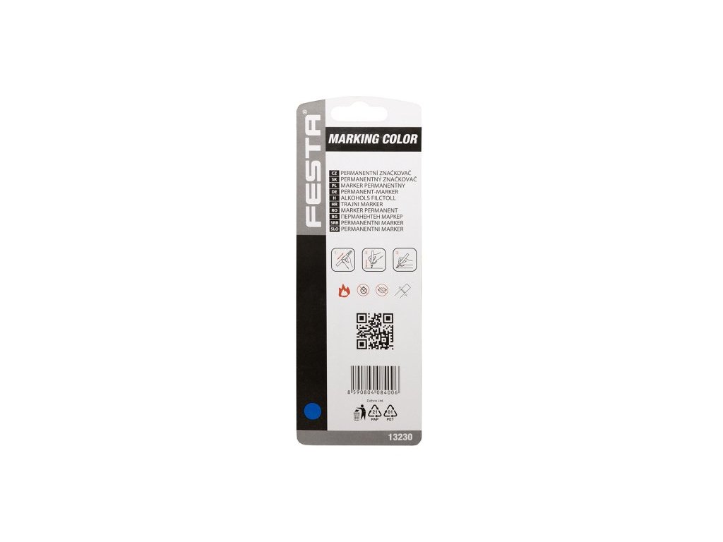 Speciální značkovací barva v hliníkovém pouzdře - modrý, síla hrotu 4 mm - popisy železných konstrukcí, skla, plastů, černých strečových folií a tmavých podkladů, max.80°C.Doplňkové parametry